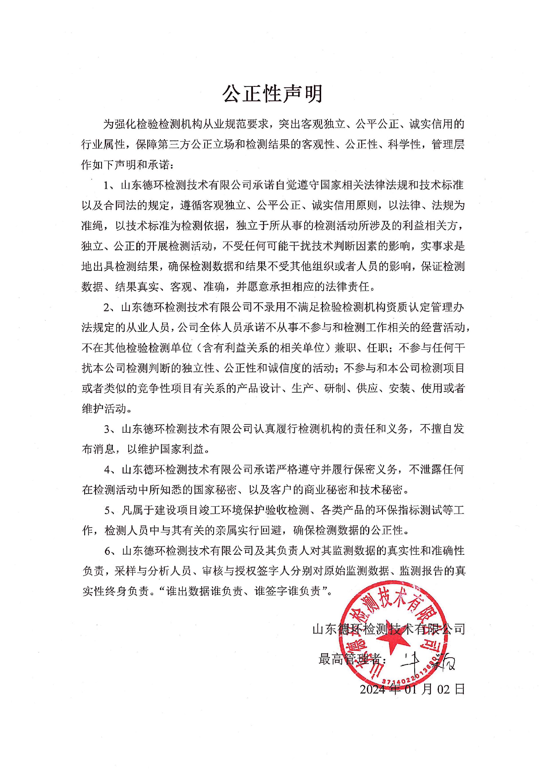為強化檢驗檢測機構從業(yè)規(guī)范要求,突出客觀獨立、公平公正、誠實信用的行業(yè)屬性,保障第三方公正立場和檢測結果的客觀性、公正性、科學性,管理層作如下聲明和承諾: 1、山東德環(huán)檢測技術有限公司承諾自覺遵守國家相關法律法規(guī)和技術標準以及合同法的規(guī)定,遵循客觀獨立、公平公正、誠實信用原則,以法律、法規(guī)為準繩,以技術標準為檢測依據(jù),獨立于所從事的檢測活動所涉及的利益相關方,獨立、公正的開展檢測活動,不受任何可能干擾技術判斷因素的影響,實事求是地出具檢測結果,確保檢測數(shù)據(jù)和結果不受其他組織或者人員的影響,保證檢測數(shù)據(jù)、結果真實、客觀、準確,并愿意承擔相應的法律責任。 2、山東德環(huán)檢測技術有限公司不錄用不滿足檢驗檢測機構資質認定管理辦法規(guī)定的從業(yè)人員,公司全體人員承諾不從事不參與和檢測工作相關的經營活動,不在其他檢驗檢測單位(含有利益關系的相關單位)兼職、任職;不參與任何干擾本公司檢測判斷的獨立性、公正性和誠信度的活動;不參與和本公司檢測項目或者類似的競爭性項目有關系的產品設計、生產、研制、供應、安裝、使用或者維護活動。 3、山東德環(huán)檢測技術有限公司認真履行檢測機構的責任和義務,不擅自發(fā)布消息,以維護國家利益。 4、山東德環(huán)檢測技術有限公司承諾嚴格遵守并履行保密義務,不泄露任何在檢測活動中所知悉的國家秘密、以及客戶的商業(yè)秘密和技術秘密。 5、凡屬于建設項目竣工環(huán)境保護驗收檢測、各類產品的環(huán)保指標測試等工作,檢測人員中與其有關的親屬實行回避,確保檢測數(shù)據(jù)的公正性。 6、山東德環(huán)檢測技術有限公司及其負責人對其監(jiān)測數(shù)據(jù)的真實性和準確性負責,采樣與分析人員、審核與授權簽字人分別對原始監(jiān)測數(shù)據(jù)、監(jiān)測報告的真實性終身負責。“誰出數(shù)據(jù)誰負責、誰簽字誰負責”。 山東德環(huán)檢測技術有限公司 最高管理者:牛穎