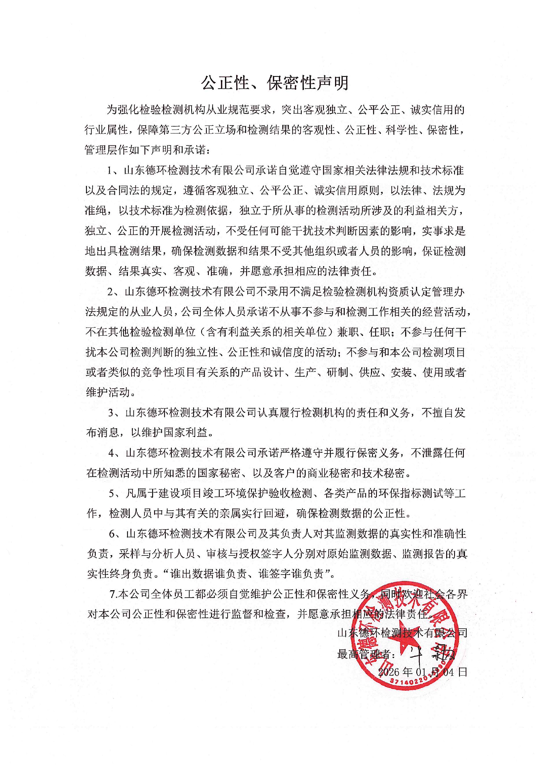 為強化檢驗檢測機構從業(yè)規(guī)范要求,突出客觀獨立、公平公正、誠實信用的行業(yè)屬性,保障第三方公正立場和檢測結果的客觀性、公正性、科學性、保密性,管理層作如下聲明和承諾: 1、山東德環(huán)檢測技術有限公司承諾自覺遵守國家相關法律法規(guī)和技術標準以及合同法的規(guī)定,遵循客觀獨立、公平公正、誠實信用原則,以法律、法規(guī)為準繩,以技術標準為檢測依據,獨立于所從事的檢測活動所涉及的利益相關方,獨立、公正的開展檢測活動,不受任何可能干擾技術判斷因素的影響,實事求是地出具檢測結果,確保檢測數據和結果不受其他組織或者人員的影響,保證檢測數據、結果真實、客觀、準確,并愿意承擔相應的法律責任。 2、山東德環(huán)檢測技術有限公司不錄用不滿足檢驗檢測機構資質認定管理辦法規(guī)定的從業(yè)人員,公司全體人員承諾不從事不參與和檢測工作相關的經營活動,不在其他檢驗檢測單位(含有利益關系的相關單位)兼職、任職;不參與任何干擾本公司檢測判斷的獨立性、公正性和誠信度的活動;不參與和本公司檢測項目或者類似的競爭性項目有關系的產品設計、生產、研制、供應、安裝、使用或者維護活動。 3、山東德環(huán)檢測技術有限公司認真履行檢測機構的責任和義務,不擅自發(fā)布消息,以維護國家利益。 4、山東德環(huán)檢測技術有限公司承諾嚴格遵守并履行保密義務,不泄露任何在檢測活動中所知悉的國家秘密、以及客戶的商業(yè)秘密和技術秘密。 5、凡屬于建設項目竣工環(huán)境保護驗收檢測、各類產品的環(huán)保指標測試等工作,檢測人員中與其有關的親屬實行回避,確保檢測數據的公正性。 6、山東德環(huán)檢測技術有限公司及其負責人對其監(jiān)測數據的真實性和準確性負責,采樣與分析人員、審核與授權簽字人分別對原始監(jiān)測數據、監(jiān)測報告的真實性終身負責。“誰出數據誰負責、誰簽字誰負責”。 7.本公司全體員工都必須自覺維護公正性和保密性義務,同時歡迎社會各界對本公司公正性和保密性進行監(jiān)督和檢查,并愿意承擔相應的法律責任。 山東德環(huán)檢測技術有限公司 2026年01月04日 微信圖片_20260104090332.jpg